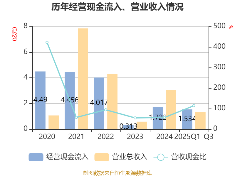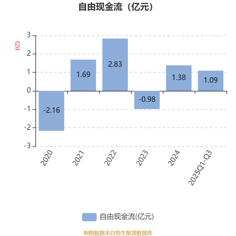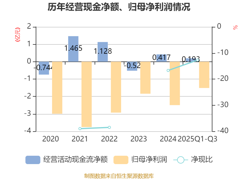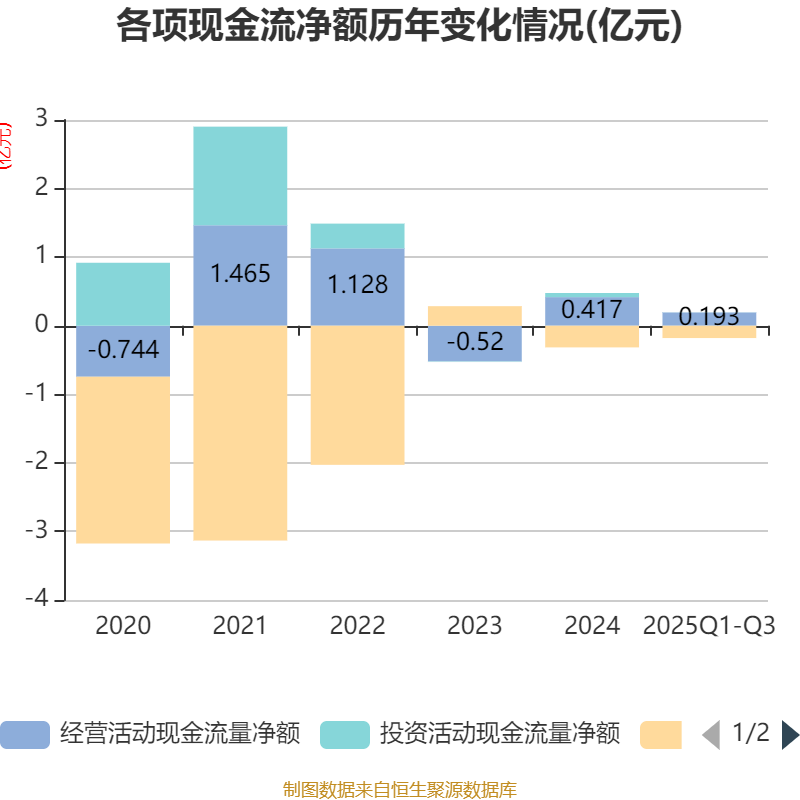 2025年前三季度,公司经营活动现金流净额为1926.55万元,同比下降37.76%;筹资活动现金流净额-1804.5万元,同比减少447.46万元;投资活动现金流净额17.94万元,上年同期为400万元。