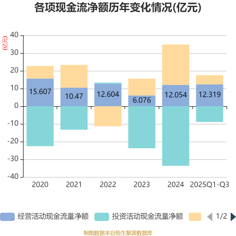 2025年前三季度,公司经营活动现金流净额为12.32亿元,同比增长34.44%;筹资活动现金流净额5.2亿元,同比减少16.82亿元;投资活动现金流净额-8.89亿元,上年同期为-25.03亿元。