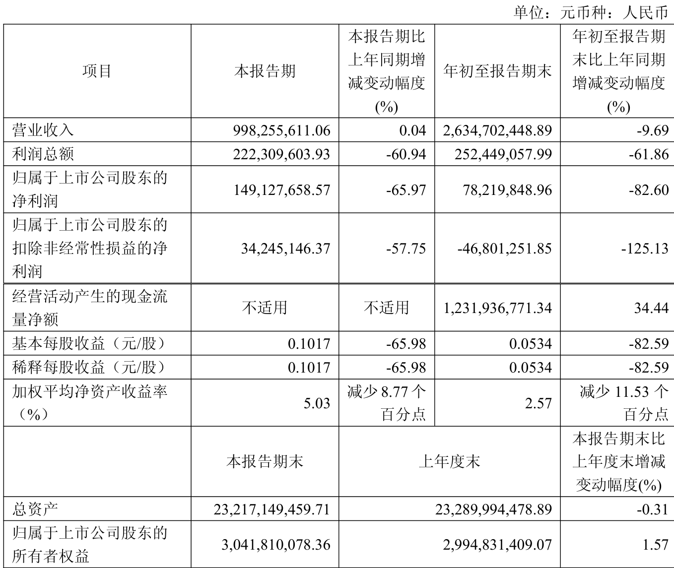 中证智能财讯广西能源(600310)10月24日披露2025年第三季度报告。前三季度公司实现营业总收入26.35亿元,同比下降9.69%;归母净利润7821.98万元,同比下降82.60%;扣非净利润亏损4680.13万元,上年同期盈利1.86亿元;经营活动产生的现金流量净额为12.32亿元,同比增长34.44%;报告期内,广西能源基本每股收益为0.0534元,加权平均净资产收益率为2.57%。