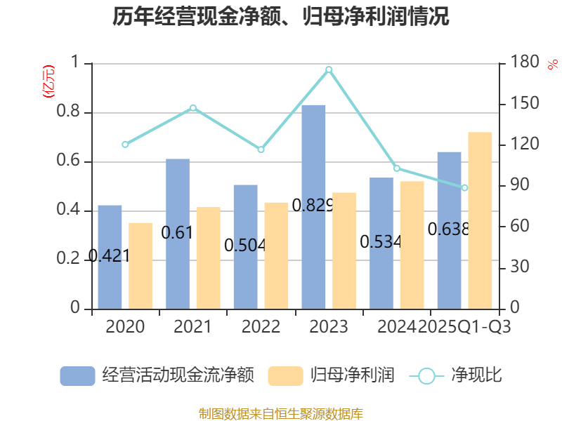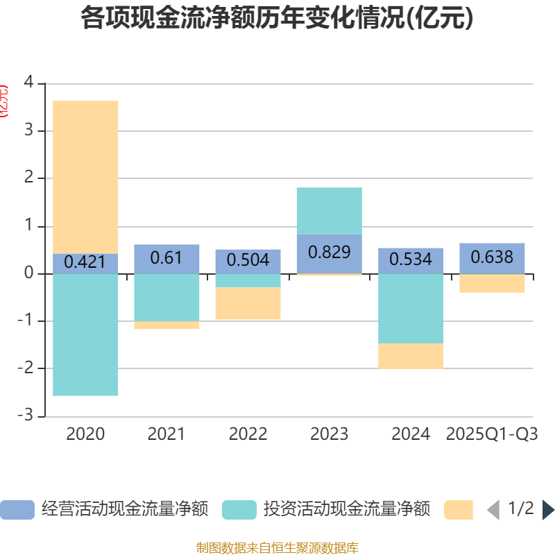 2025年前三季度,公司经营活动现金流净额为6378.42万元,同比增长65.58%;筹资活动现金流净额-3913.66万元,同比减少2558.97万元;投资活动现金流净额-131.44万元,上年同期为-2.02亿元。