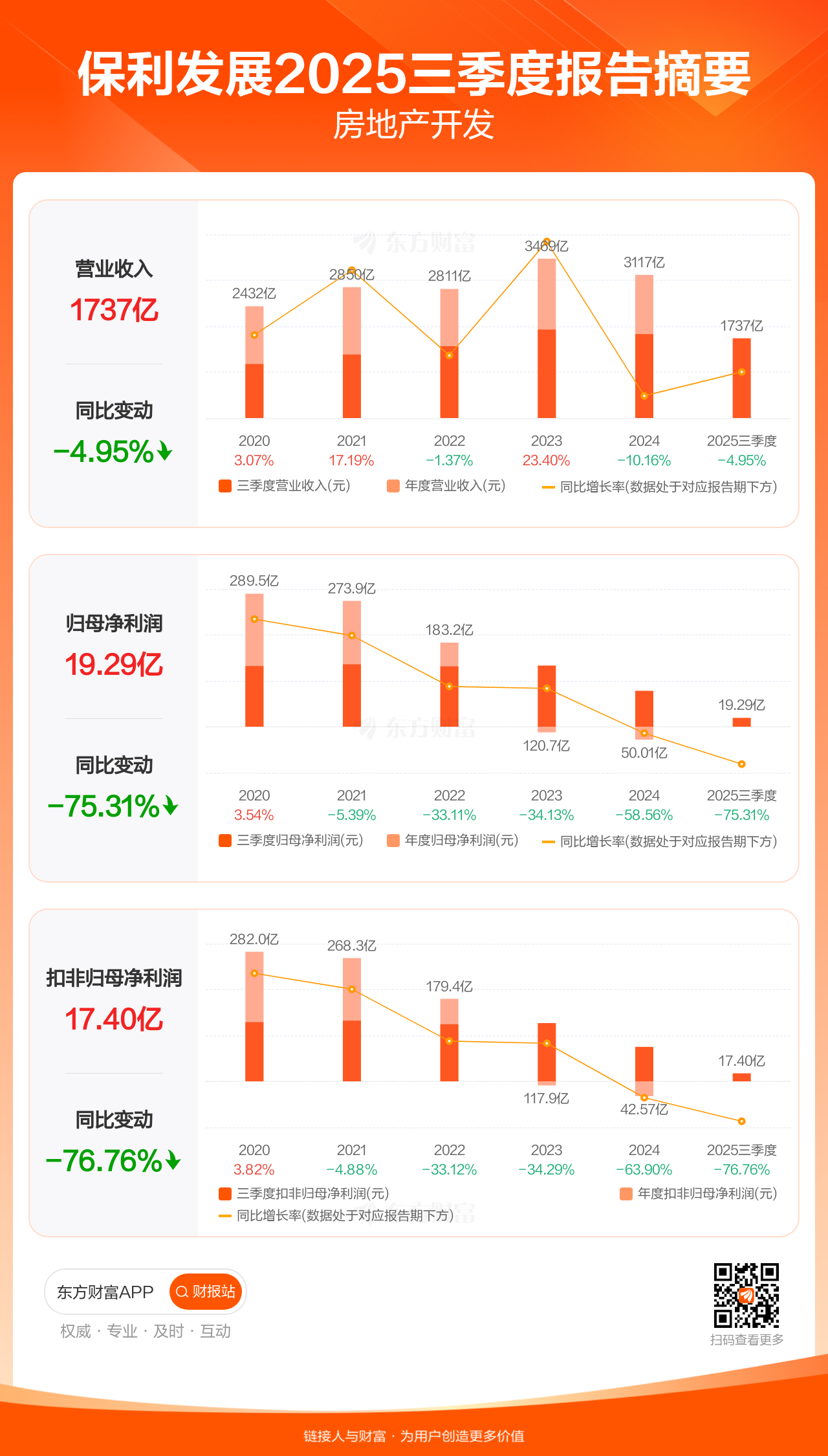 保利发展10月22日发布2025年三季报显示,公司前三季实现营业收入1737.22亿元,同比下滑4.95%;归母净利润19.29亿元,同比下滑75.31%;扣非归母净利润17.40亿元,同比下滑76.76%。每股EPS0.16元,低于机构一致预测的0.38元。