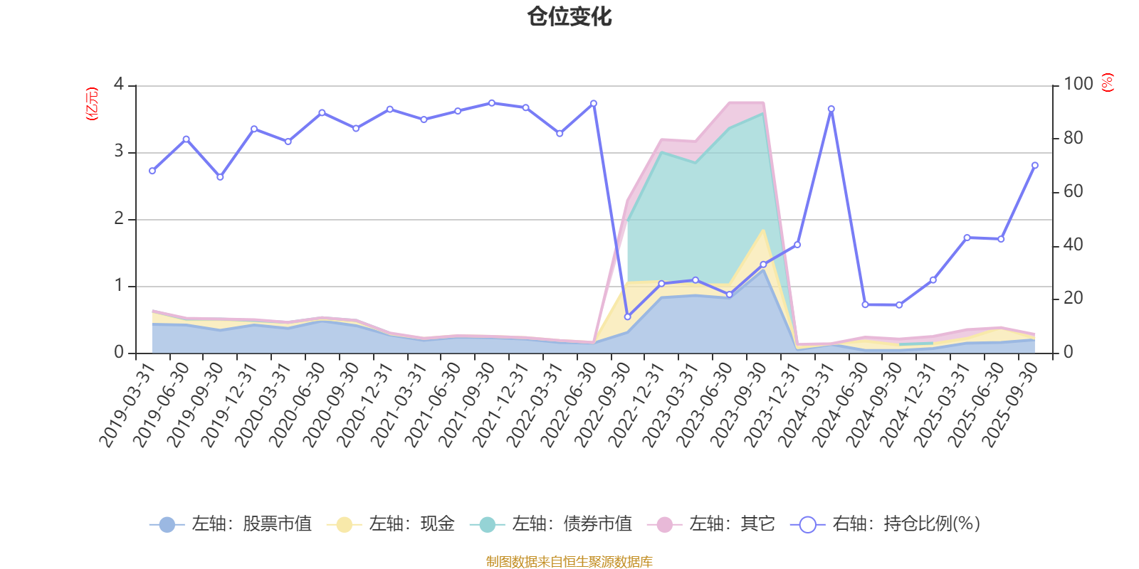 据定期报告数据统计,近三年平均股票仓位为38.29%,同类平均为72.12%。2021年三季度末基金达到93.42%的最高仓位,2022年三季度末最低,为13.58%。