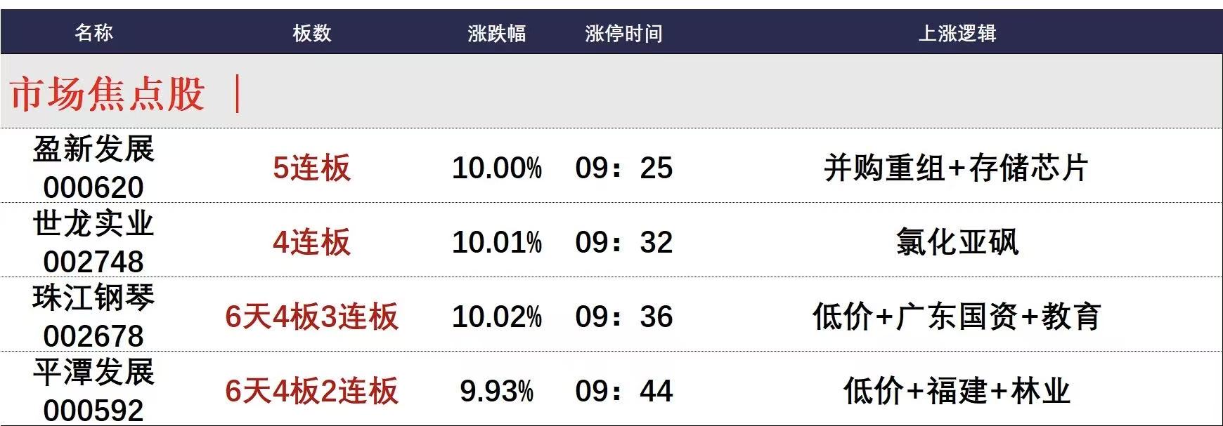 今日午盘全市场共39股涨停,连板股总数9只,17股封板未遂,封板率为70%(不含ST股、退市股)。焦点股方面,昨日高度板大有能源跌近7%,市场连板高度压缩至5连板的盈新发展,氯化亚砜概念股世龙实业4连板,低价股珠江钢琴、珠江钢琴均走出6天4板。