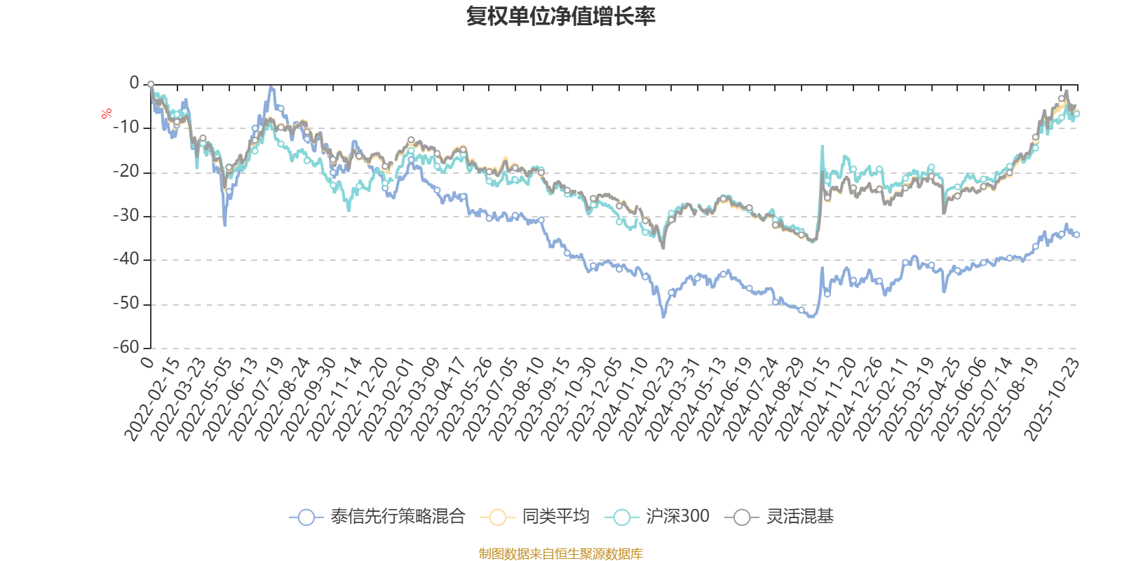 截至10月23日,泰信先行策略混合近三个月复权单位净值增长率为8.59%,位于同类可比基金744/1287;近半年复权单位净值增长率为13.06%,位于同类可比基金896/1287;近一年复权单位净值增长率为18.92%,位于同类可比基金641/1287;近三年复权单位净值增长率为-17.59%,位于同类可比基金1181/1286。