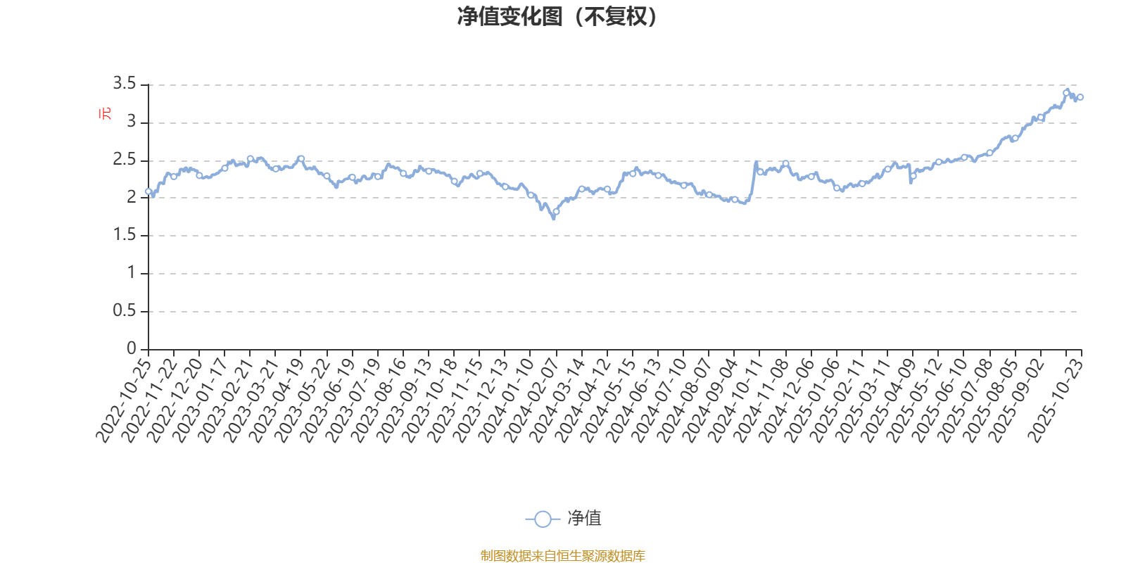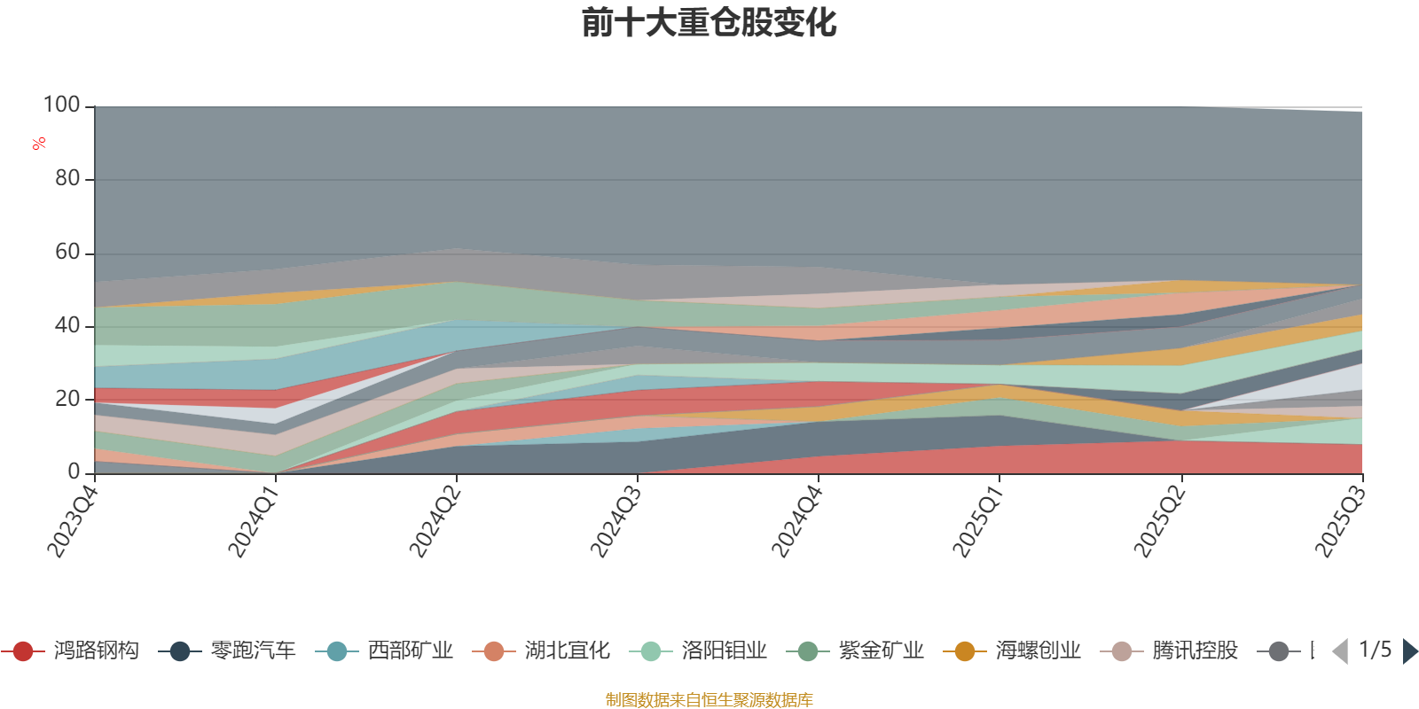 该基金持股集中度较高。截至2025年三季度末,基金十大重仓股分别是鸿路钢构、铜陵有色、洛阳钼业、华夏航空、瀚蓝环境、图南股份、阿里巴巴-W、金风科技、越秀地产、腾讯控股。