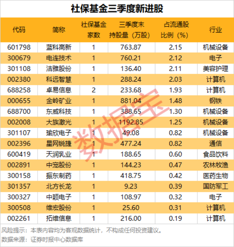 从持股比例看,新进股中社保基金持有比例最多的是蓝科高新,持股量占流通股比例为2.15%;其次是电连技术,社保基金持股比例为2.12%;持股比例居前的还有洁雅股份、科远智慧、卓易信息等。