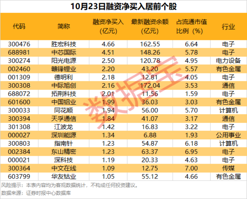 具体到个股,10月23日获融资净买入千万元以上的有384只,其中17只融资净买入额超1亿元。胜宏科技融资净买入额居首,当日净买入4.66亿元;其次是中芯国际、阳光电源,融资净买入金额分别为4.51亿元、2.50亿元;融资净买入金额居前的还有赣锋锂业、德明利、中际旭创等。