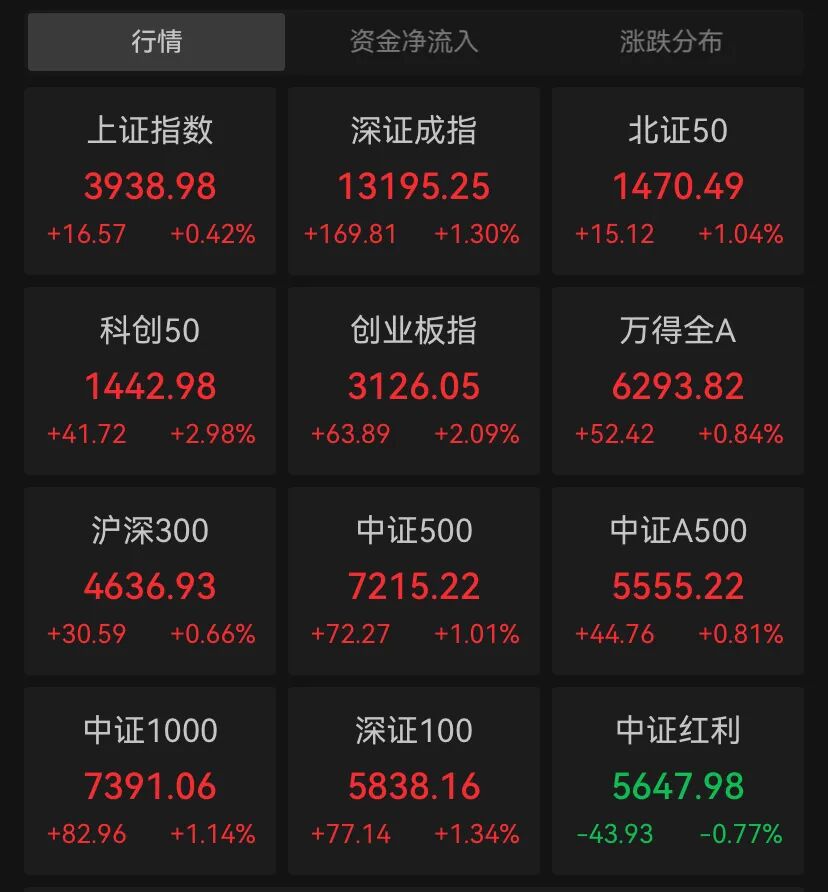 10月24日早间,A股主要指数强势拉升,沪指盘中突破前期高点,再创今年以来新高。截至午间收盘,上证指数涨0.42%,报3938.98点;深证成指涨1.3%,报13195.25点;创业板指涨2.09%,报3126.05点。沪深两市半日成交额1.23万亿元,成交量显著放大。