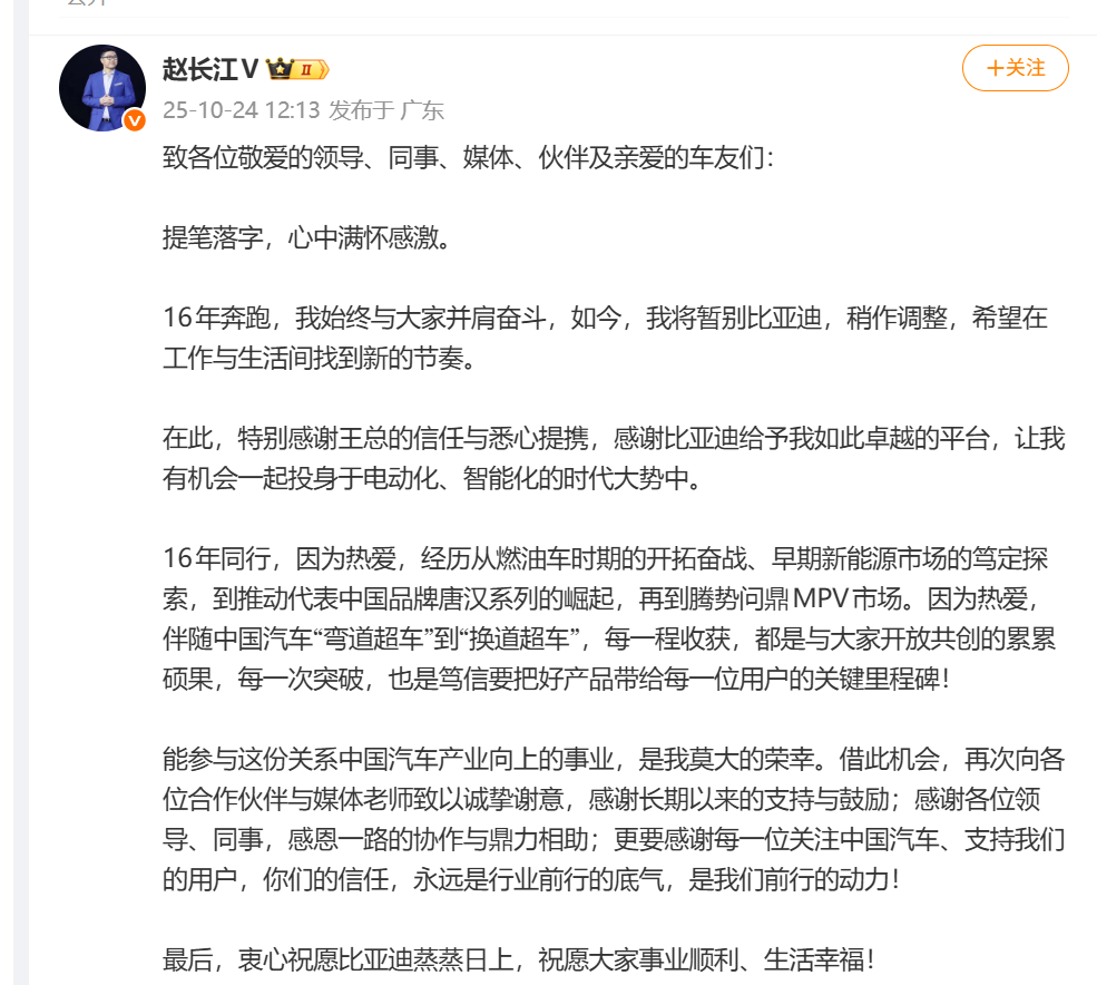 10月24日,腾势方程豹直营事业部总经理赵长江发文官宣离职:如今将暂别比亚迪,稍作调整,希望在工作与生活间找到新的节奏。