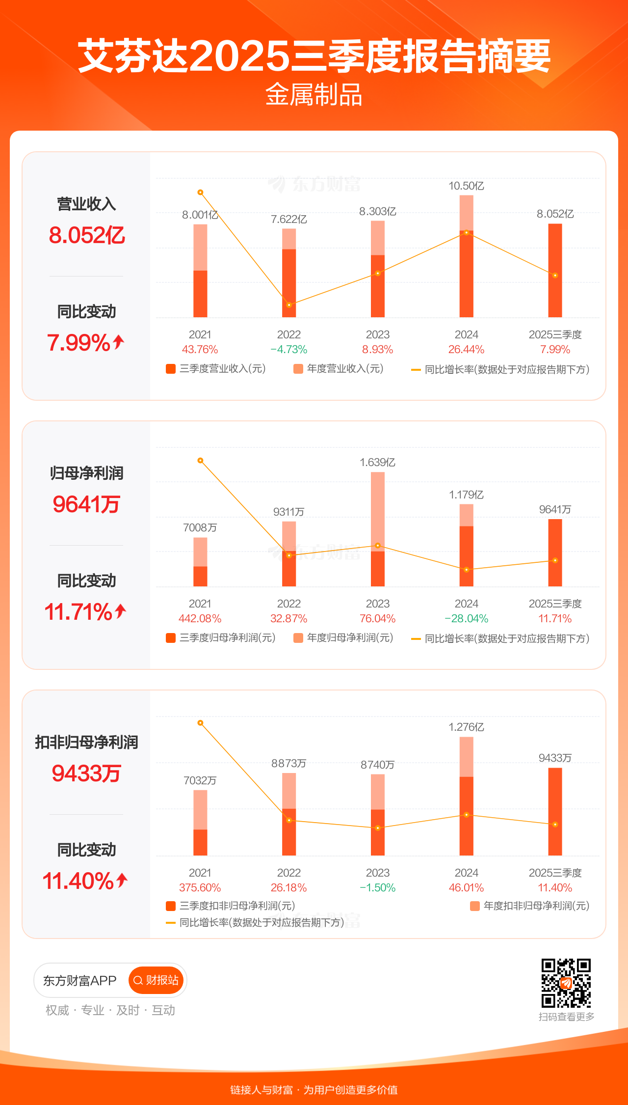 艾芬达10月23日发布2025年三季报显示,公司前三季实现营业收入8.05亿元,同比增长7.99%;归母净利润9640.55万元,同比增长11.71%;扣非归母净利润9433.44万元,同比增长11.40%。每股EPS1.44元,低于机构一致预测的1.69元。