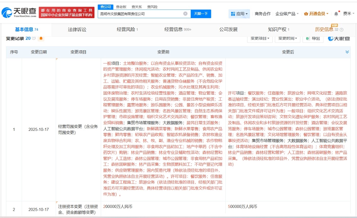 昆明市文旅集团增资至50亿 增幅150%