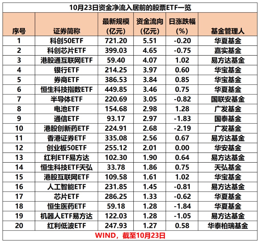 10月23日,A股大盘探底回升,三大指数全线收涨。当日股票ETF(含跨境ETF)整体资金净流入达33.6亿元。