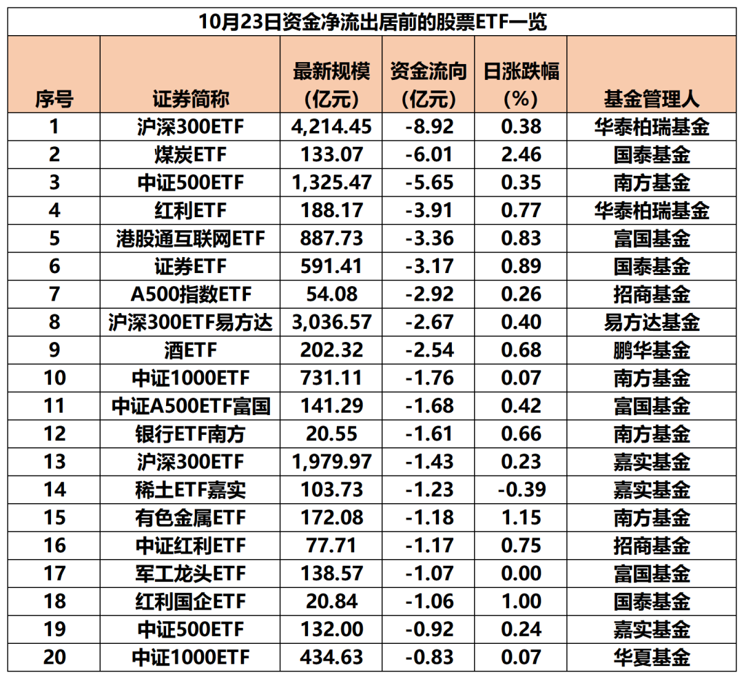 10月23日,三大指数全线收红,煤炭、能源金属等板块轮番演绎。股票ETF(含跨境ETF)整体资金净流入超33亿元。芯片、银行、券商等相关热门主题ETF成为“吸金”主力,沪深300、中证500、A500指数等相关宽基ETF成为“失血”大户。