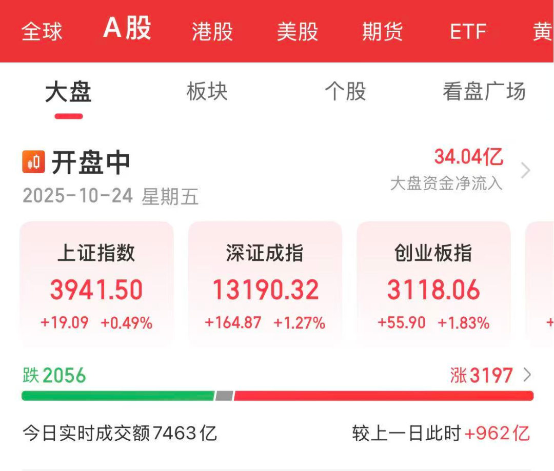 10月24日,A股三大股指集体高开,沪指涨0.17%,深成指涨0.51%,创业板指涨0.83%。