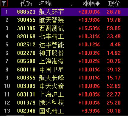 商业航天板块高开,航天环宇(688523)、航天智装(300455)双双“20cm”涨停,西测测试、七丰精工等涨幅居前。