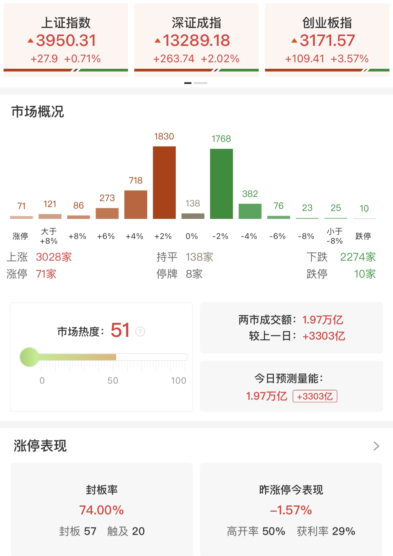 财联社10月24日电,市场全天震荡反弹,沪指刷新年内新高,创业板指领涨。沪深两市成交额1.97万亿,较上一个交易日放量3303亿。从板块来看,算力硬件方向持续爆发,CPO概念股领涨,“光模块”三巨头齐发力,中际旭创大涨超12%创历史新高,汇绿生态5天3板。存储芯片概念股全天走强,香农芯创、普冉股份20cm涨停双双创新高。商业航天板块掀起涨停潮,航天科技等十余股涨停。下跌方面,煤炭股集体调整,安泰集团跌停。板块方面,存储芯片、CPO、半导体等板块涨幅居前,煤炭、油气等板块跌幅居前。截至收盘,沪指涨0.71%,深成指涨2.02%,创业板指涨3.57%。