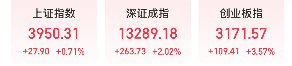 今天,科技股全面爆发。A股三大股指齐涨,上证指数创今年以来新高。截至收盘,上证指数上涨0.71%,报3950.31点;深证成指上涨2.02%,创业板指上涨3.57%。
