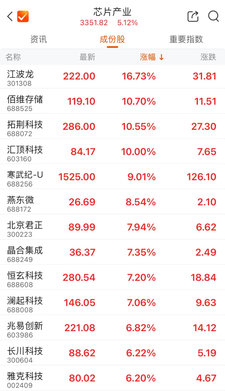 午后,芯片股持续走高,算力芯片龙头寒武纪一度涨超10%,重返1500元上方,截至收盘仍涨9.01%,汇顶科技涨停,江波龙、佰维存储、拓荆科技均涨超10%,燕东微、北京君正、晶合集成等跟涨。