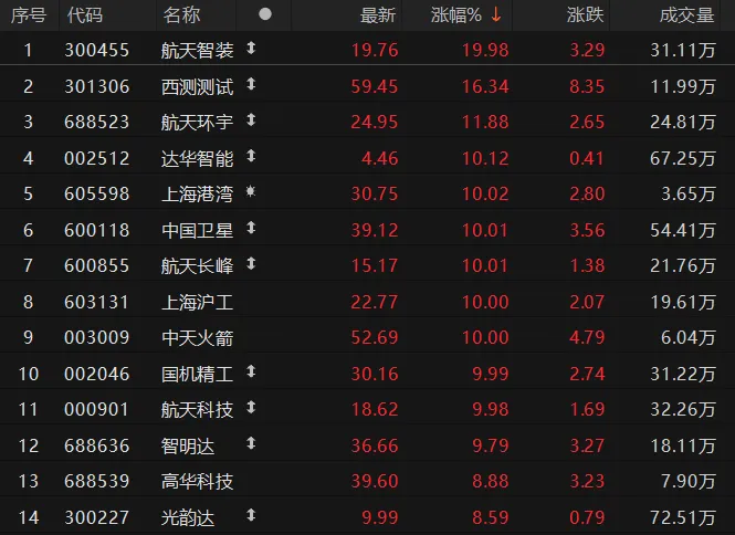 当日,A股航空航天板块开盘大涨。截至收盘,航天智装“20cm”涨停,西测测试涨超16%,航天环宇涨超11%,达华智能、上海港湾、中国卫星、航天长峰等多股涨停。