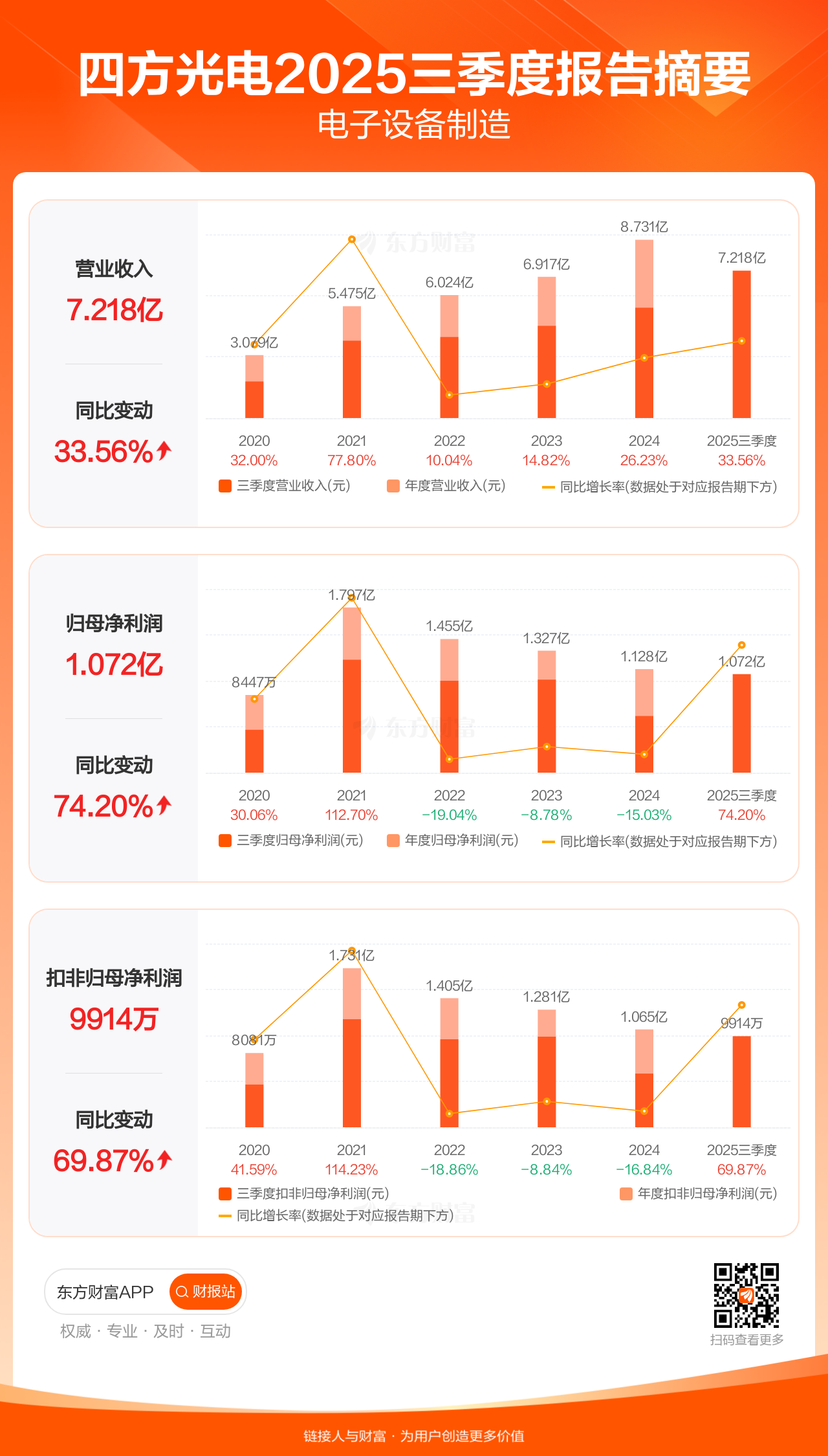 四方光电10月25日发布2025年三季报显示,公司前三季实现营业收入7.22亿元,同比增长33.56%;归母净利润1.07亿元,同比增长74.20%;扣非归母净利润9914.32万元,同比增长69.87%。每股EPS1.07元,低于机构一致预测的1.42元。