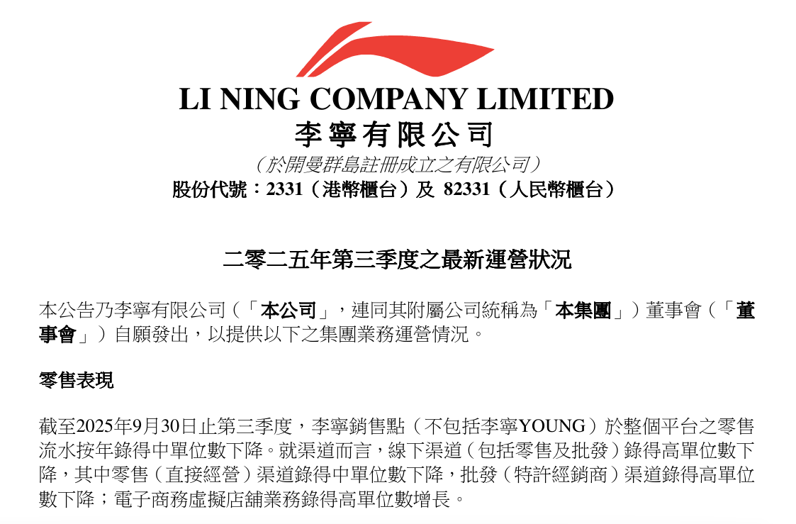 10月24日午间,李宁(港股代码:02331)公布2025年第三季度运营状况。