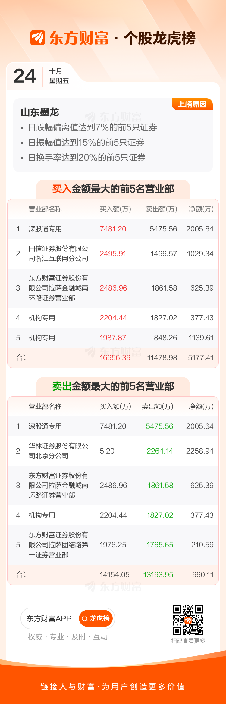 交易所2025年10月24日公布的交易公开信息显示,山东墨龙因成为日跌幅偏离值达到7%的前5只证券、日振幅值达到15%的前5只证券、日换手率达到20%的前5只证券上榜。山东墨龙当日收报8.42元,涨跌幅-10.04%,偏离值-11.36%,换手率34.39%,成交额16.50亿。