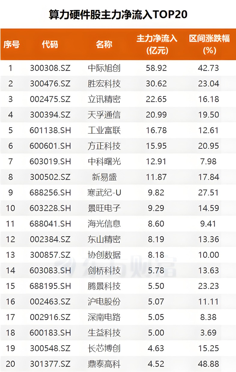 具体来看,10月15日至今,中际旭创主力净流入近60亿元,排名第一,期间上涨超40%;PCB龙头胜宏科技排名第二,主力净流入超30亿元。