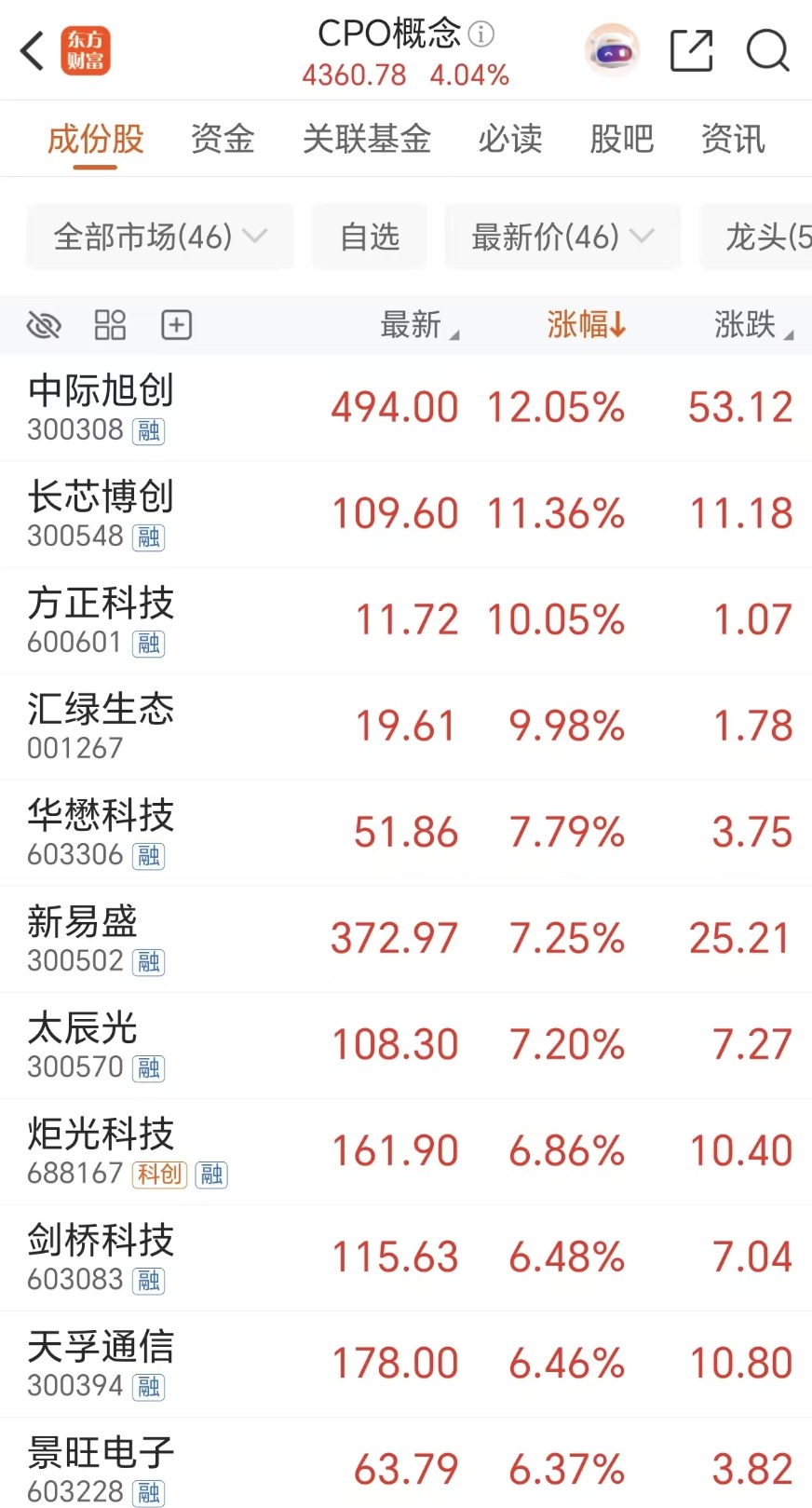 周五(10月24日)算力硬件方向再度爆发,CPO概念股领涨,“光模块”三巨头齐发力,5000亿巨头中际旭创大涨超12%,再创历史新高,新易盛涨超7%,天孚通信涨超6%;寒武纪收涨超9%,再度超越茅台重夺A股“股王”宝座;PCB巨头生益电子业绩超预期,收盘20CM涨停。