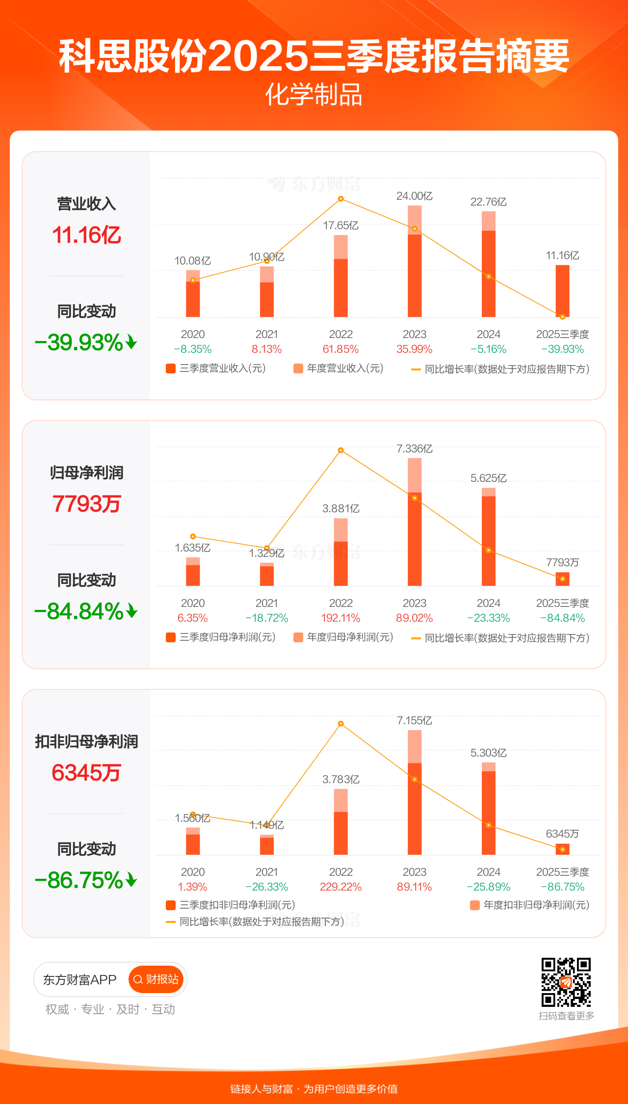 科思股份10月23日发布2025年三季报显示,公司前三季实现营业收入11.16亿元,同比下滑39.93%;归母净利润7793.47万元,同比下滑84.84%;扣非归母净利润6345.19万元,同比下滑86.75%。每股EPS0.16元,低于机构一致预测的0.76元。