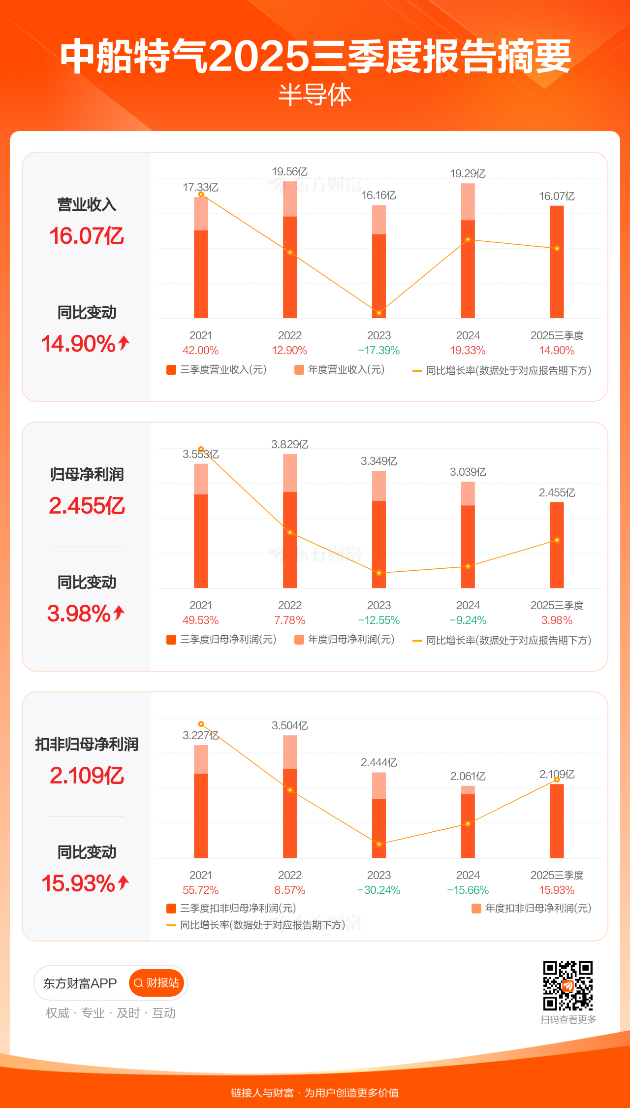 中船特气10月25日发布2025年三季报显示,公司前三季实现营业收入16.07亿元,同比增长14.90%;归母净利润2.45亿元,同比增长3.98%;扣非归母净利润2.11亿元,同比增长15.93%。每股EPS0.46元,低于机构一致预测的0.77元。