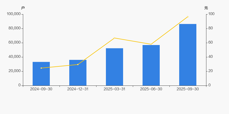 自2024年9月30日以来,公司股东户数连续4期上涨,截至目前增幅为160.81%。2024年9月30日至2025年9月30日区间股价上涨294.74%。