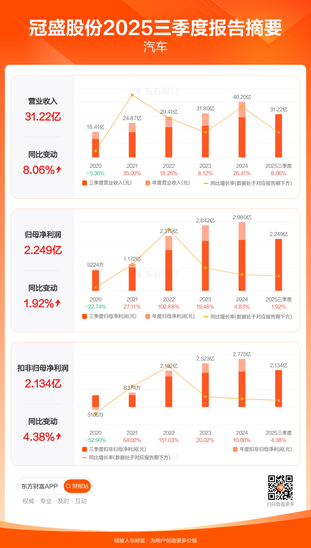 冠盛股份10月25日发布2025年三季报显示,公司前三季实现营业收入31.22亿元,同比增长8.06%;归母净利润2.25亿元,同比增长1.92%;扣非归母净利润2.13亿元,同比增长4.38%。每股EPS1.23元,低于机构一致预测的1.87元。