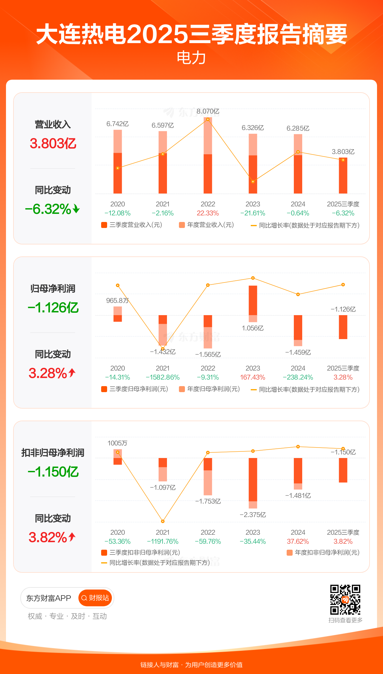 大连热电10月25日发布2025年三季报显示,公司前三季实现营业收入3.80亿元,同比下滑6.32%;归母净利润-1.13亿元;扣非归母净利润-1.15亿元。每股EPS-0.28元,高于机构一致预测的null元。