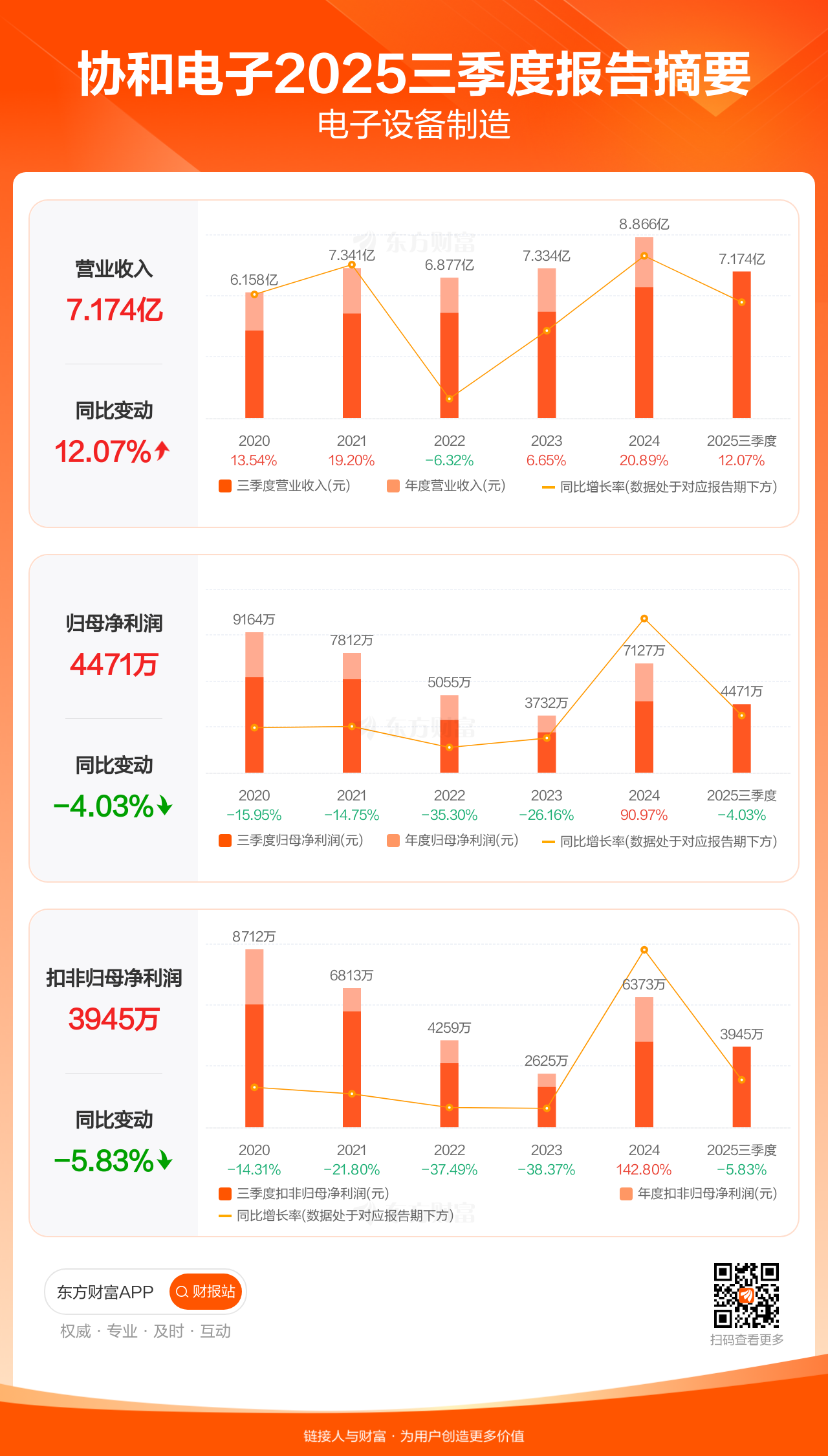 协和电子10月25日发布2025年三季报显示,公司前三季实现营业收入7.17亿元,同比增长12.07%;归母净利润4471.21万元,同比下滑4.03%;扣非归母净利润3945.38万元,同比下滑5.83%。每股EPS0.51元,高于机构一致预测的null元。