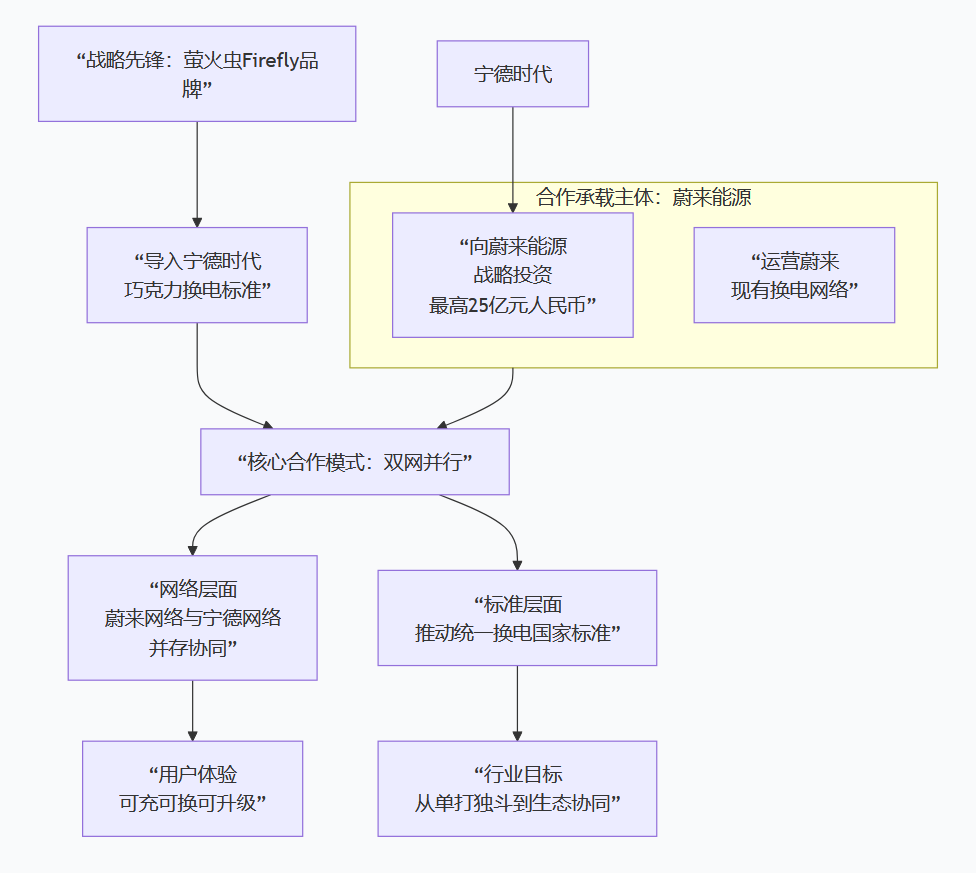 2025年3月,宁德时代入股蔚来能源,开启“双网并行”合作。蔚来超3100座换电站保持独立,服务高端用户,而新品牌“萤火虫”导入巧克力换电标准,共享双方网络。