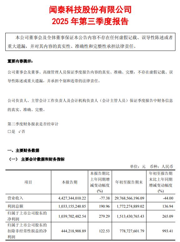闻泰科技:第三季度净利润同比增长279.29%