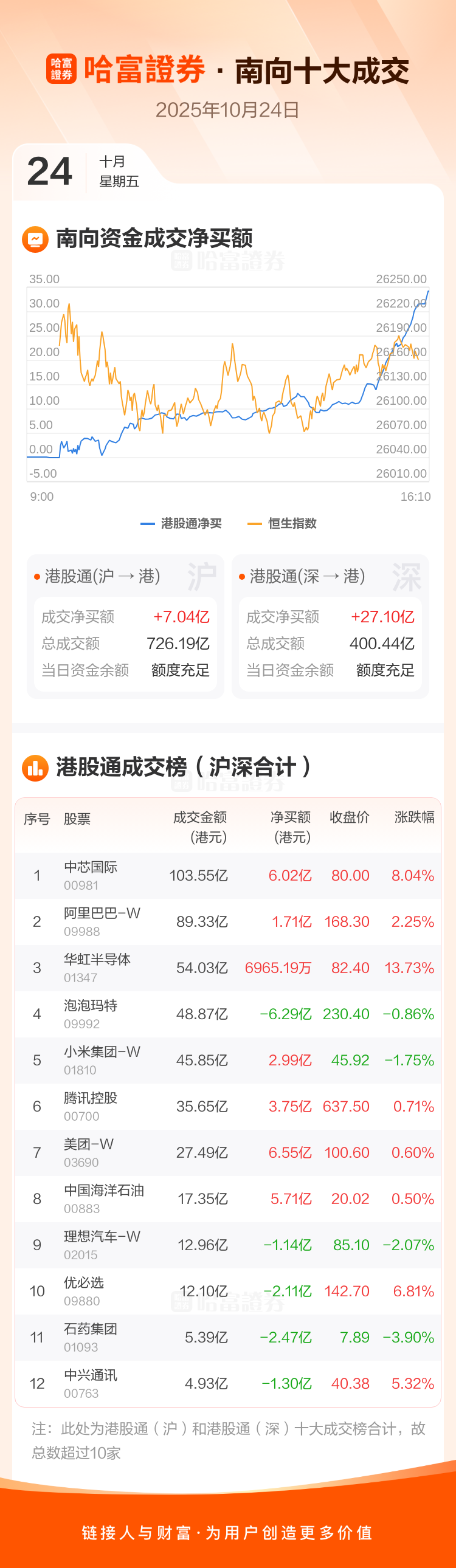 恒生指数10月24日涨0.74%,收报26160.15点。南向资金今日净买入港股34.14亿港元。南向资金今日成交额1126.62亿港元,港股大市成交2266.14亿港元。