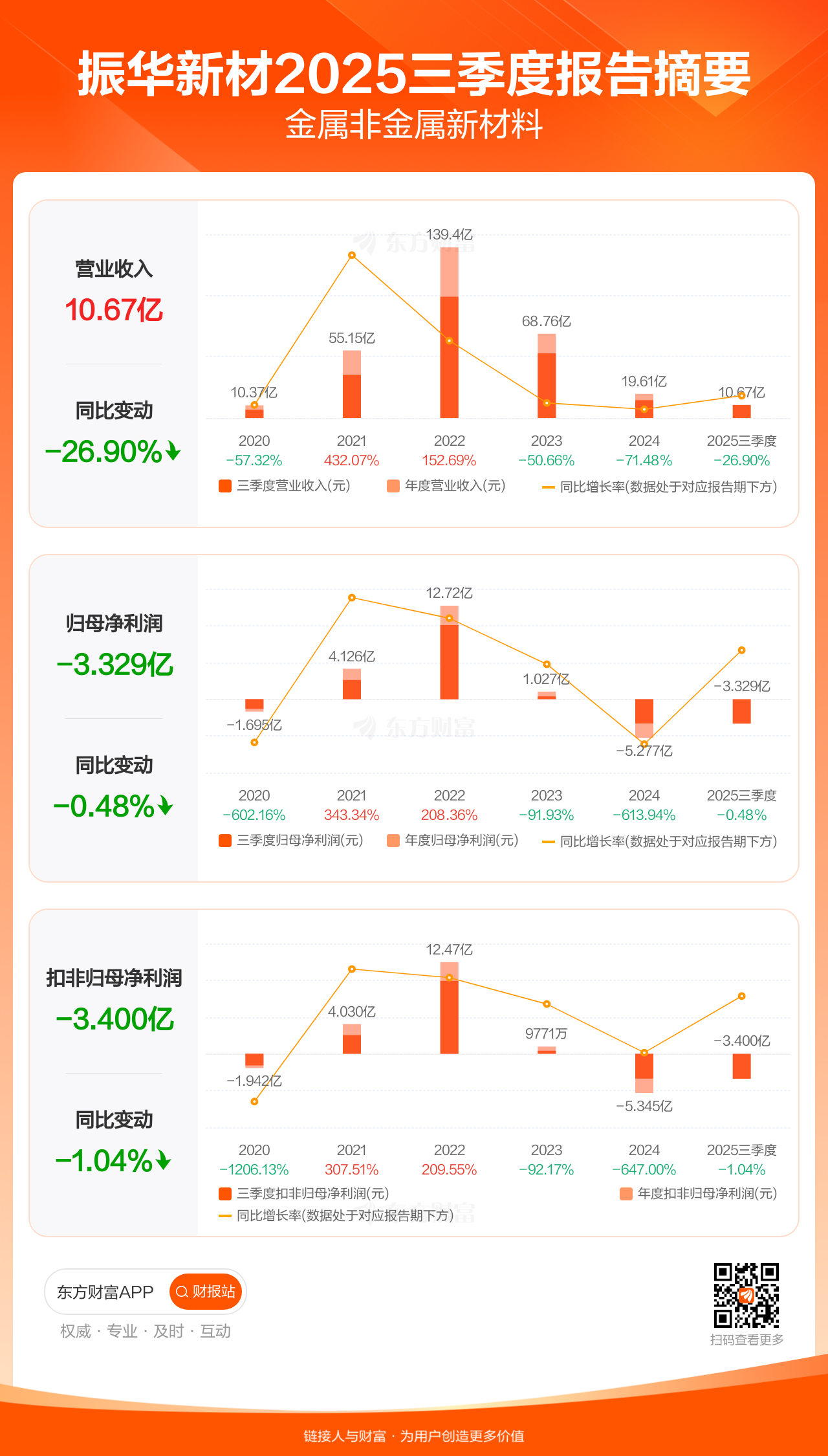 振华新材10月25日发布2025年三季报显示,公司前三季实现营业收入10.67亿元,同比下滑26.90%;归母净利润-3.33亿元;扣非归母净利润-3.40亿元。每股EPS-0.65元,低于机构一致预测的-0.17元。