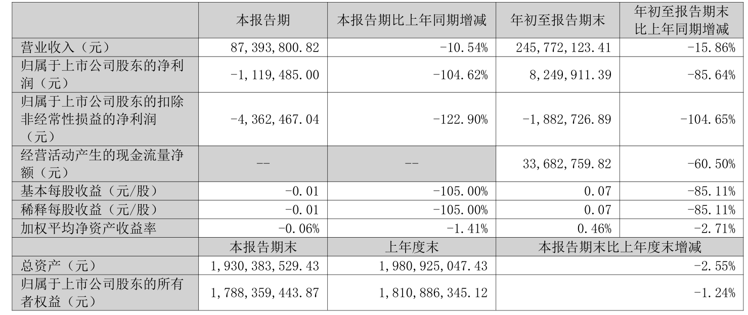 中证智能财讯采纳股份(301122)10月25日披露2025年第三季度报告。前三季度公司实现营业总收入2.46亿元,同比下降15.86%;归母净利润824.99万元,同比下降85.64%;扣非净利润亏损188.27万元,上年同期盈利4050.32万元;经营活动产生的现金流量净额为3368.28万元,同比下降60.50%;报告期内,采纳股份基本每股收益为0.07元,加权平均净资产收益率为0.46%。