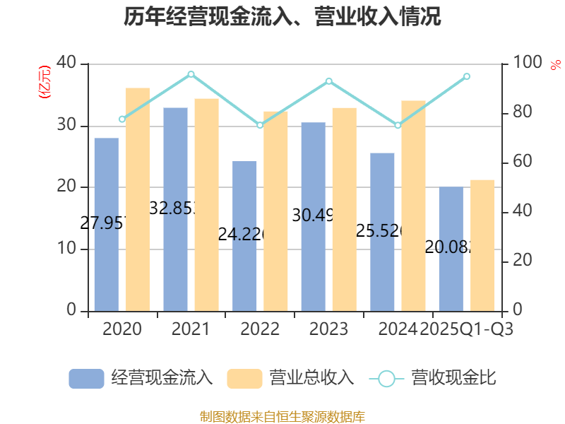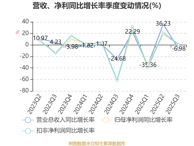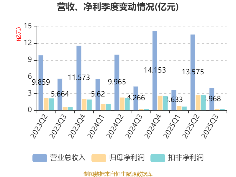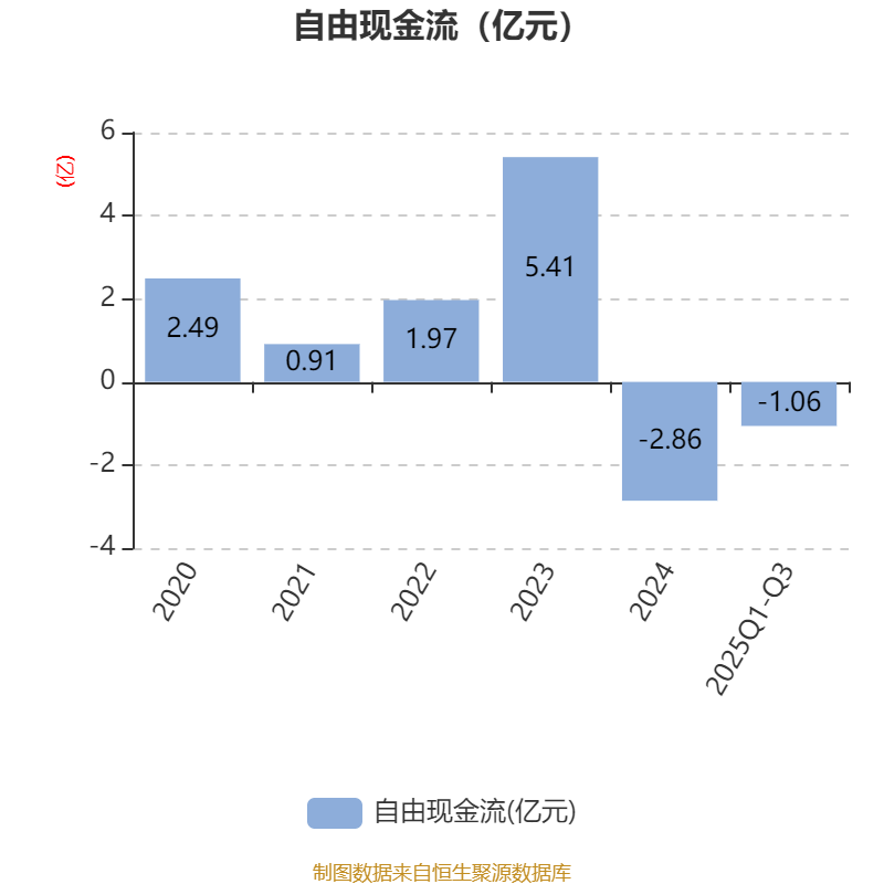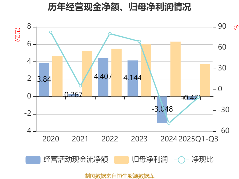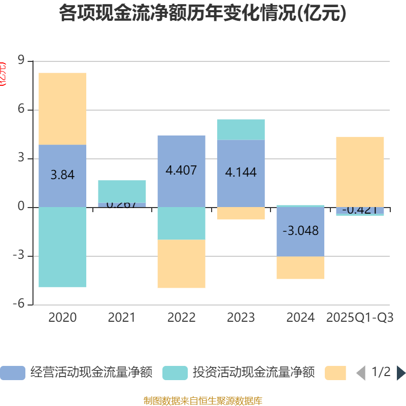 2025年前三季度,公司经营活动现金流净额为-4205.79万元,同比增加6.02亿元;筹资活动现金流净额4.32亿元,同比增加6.96亿元;投资活动现金流净额-1111.75万元,上年同期为1181.48万元。