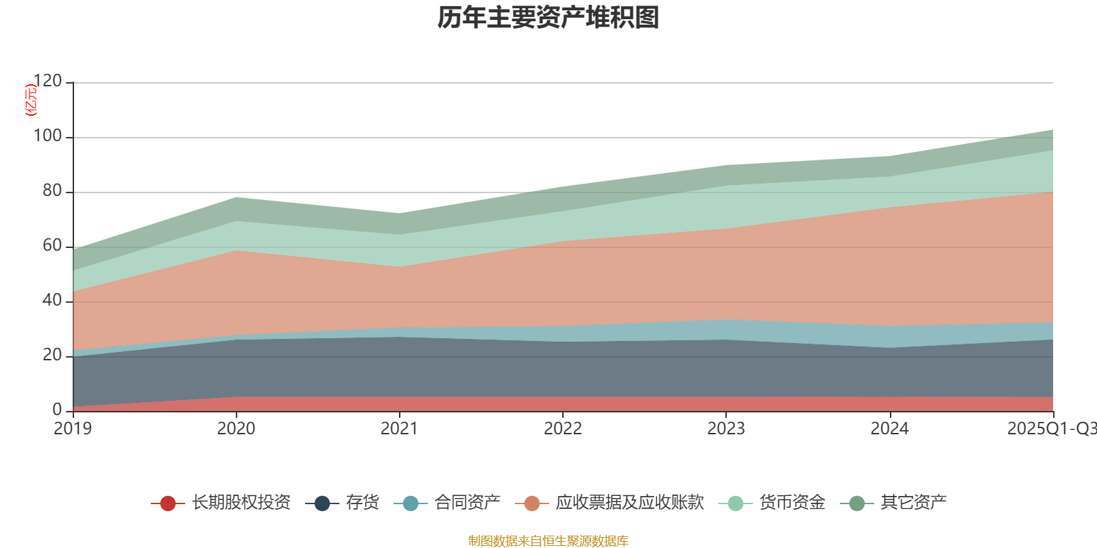 资产重大变化方面,截至2025年三季度末,公司货币资金较上年末增加33.43%,占公司总资产比重上升2.54个百分点;合同资产较上年末减少20.39%,占公司总资产比重下降2.39个百分点;存货较上年末增加17.91%,占公司总资产比重上升1.3个百分点;长期股权投资较上年末减少4.08%,占公司总资产比重下降0.74个百分点。