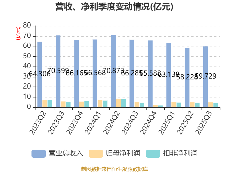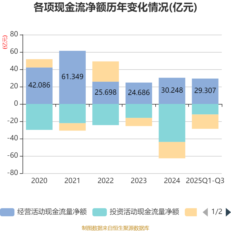 2025年前三季度,公司经营活动现金流净额为29.31亿元,同比增长198.65%;筹资活动现金流净额-16.58亿元,同比增加4.39亿元;投资活动现金流净额-12.11亿元,上年同期为-30.11亿元。