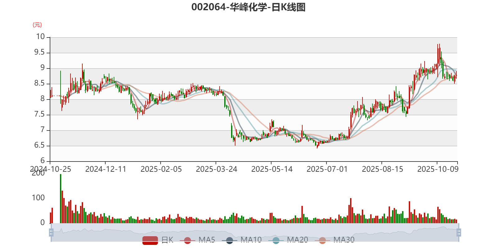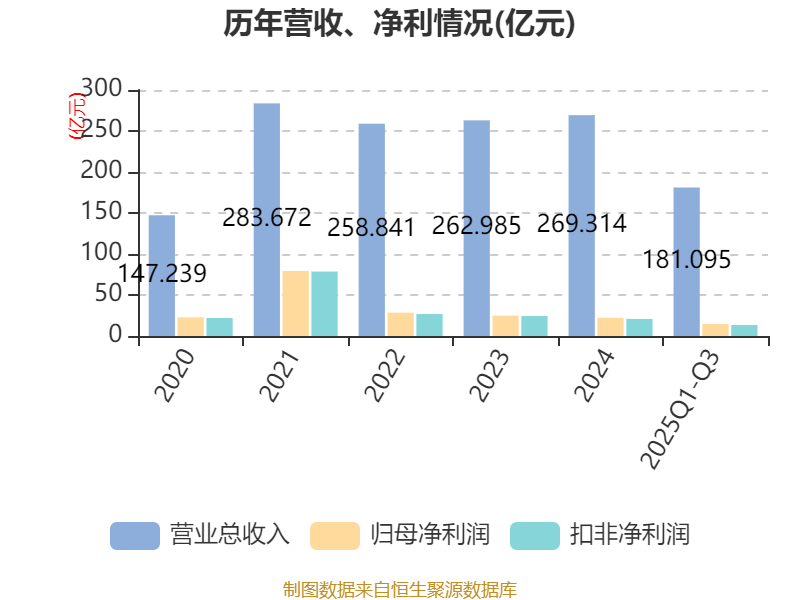 中证智能财讯华峰化学(002064)10月25日披露2025年第三季度报告。前三季度公司实现营业总收入181.09亿元,同比下降11.11%;归母净利润14.62亿元,同比下降27.45%;扣非净利润13.43亿元,同比下降29.62%;经营活动产生的现金流量净额为29.31亿元,同比增长198.65%;报告期内,华峰化学基本每股收益为0.29元,加权平均净资产收益率为5.46%。
