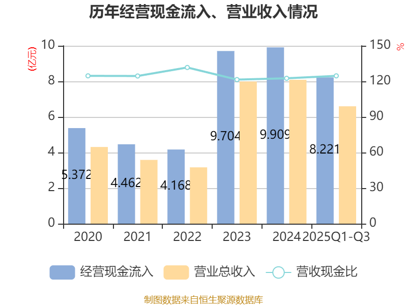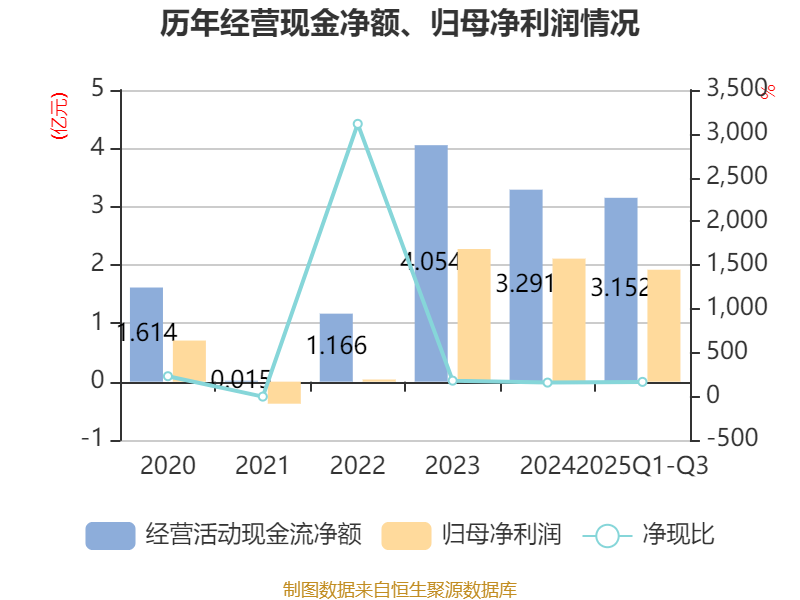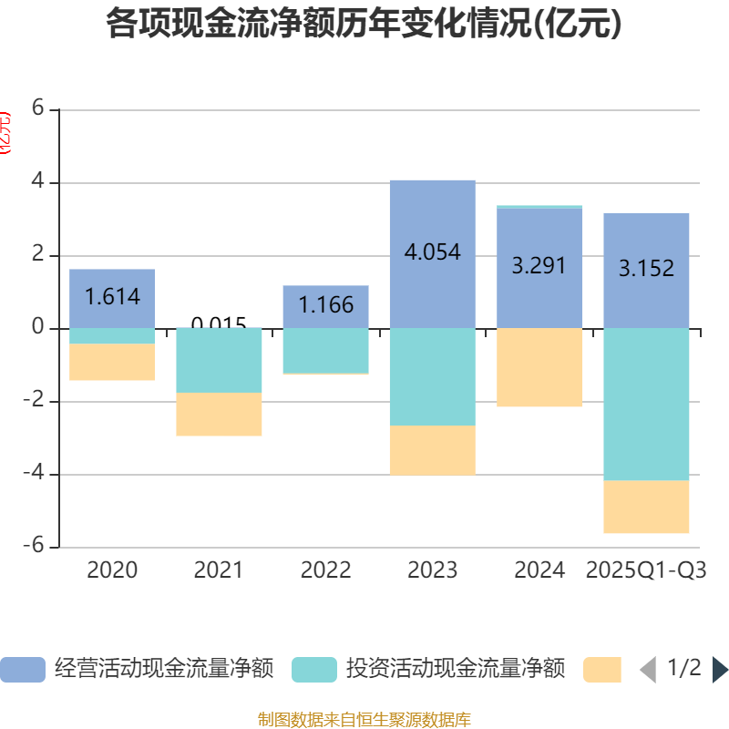 2025年前三季度,公司经营活动现金流净额为3.15亿元,同比增长13.8%;筹资活动现金流净额-1.44亿元,同比增加7092.65万元;投资活动现金流净额-4.19亿元,上年同期为5497.3万元。