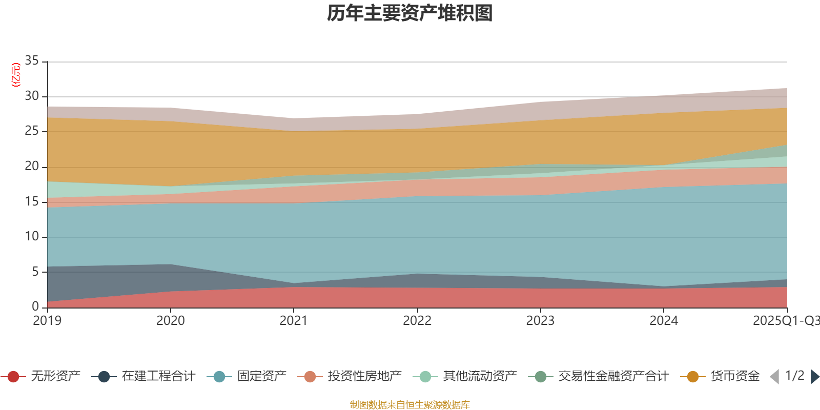 资产重大变化方面,截至2025年三季度末,公司货币资金较上年末减少29.34%,占公司总资产比重下降7.81个百分点;交易性金融资产合计占公司总资产的5.29%,上年末为0;固定资产较上年末减少3.54%,占公司总资产比重下降3.18个百分点;在建工程合计较上年末增加253.81%,占公司总资产比重上升2.5个百分点。