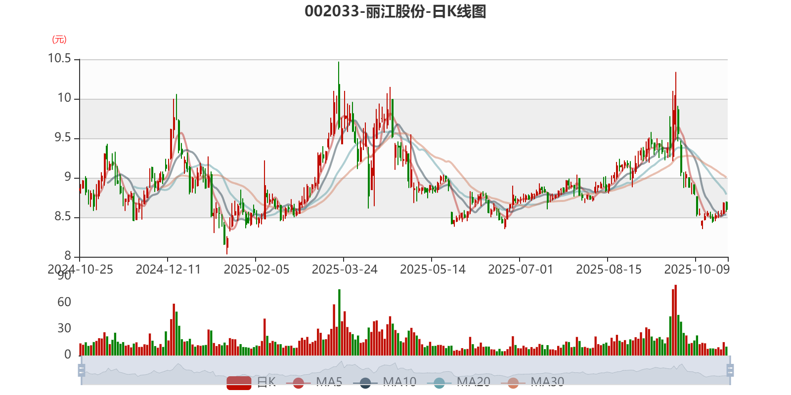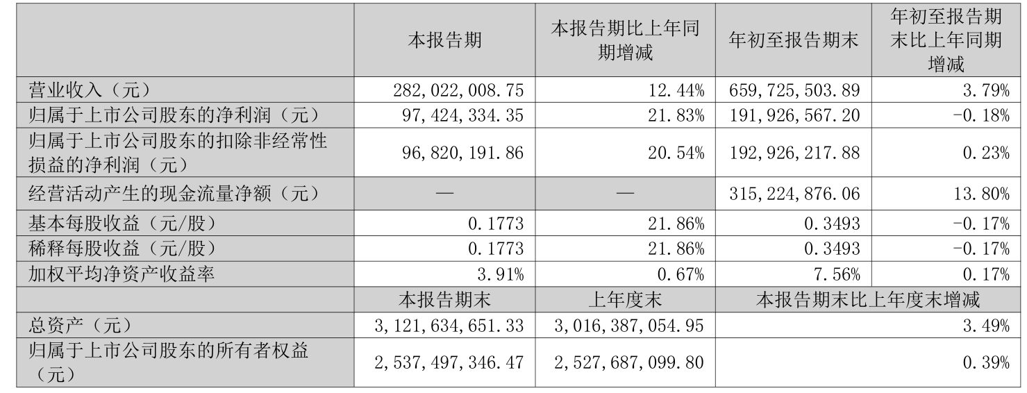中证智能财讯丽江股份(002033)10月25日披露2025年第三季度报告。前三季度公司实现营业总收入6.6亿元,同比增长3.79%;归母净利润1.92亿元,同比下降0.18%;扣非净利润1.93亿元,同比增长0.23%;经营活动产生的现金流量净额为3.15亿元,同比增长13.80%;报告期内,丽江股份基本每股收益为0.3493元,加权平均净资产收益率为7.56%。