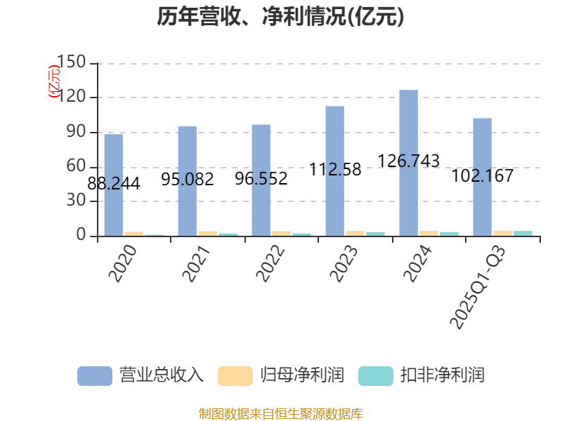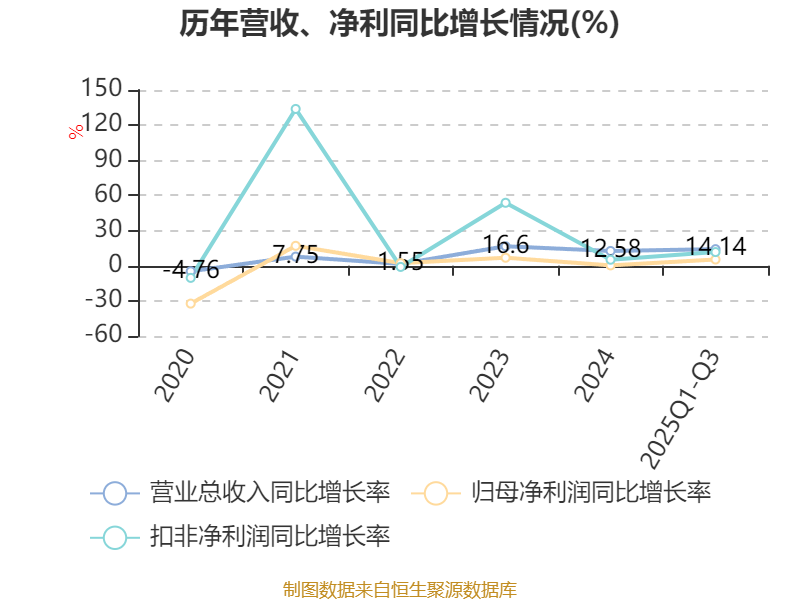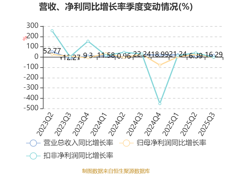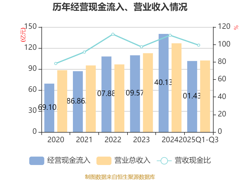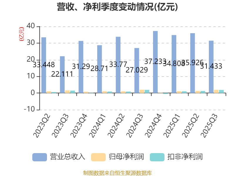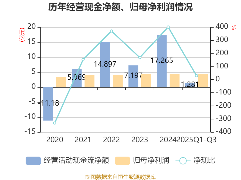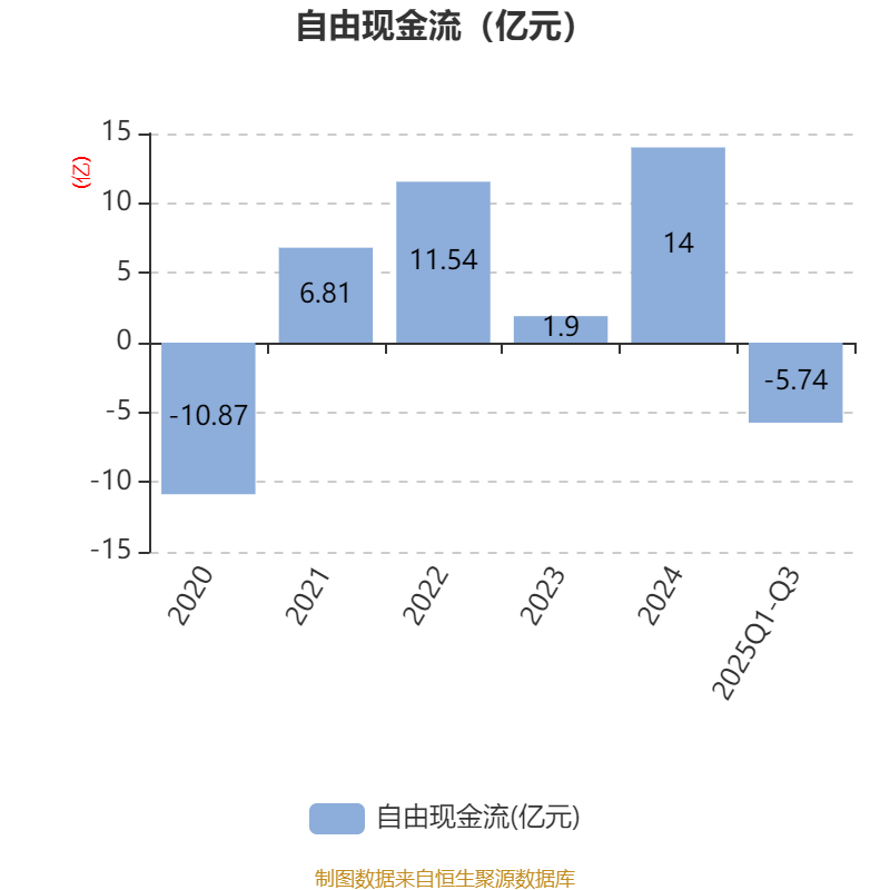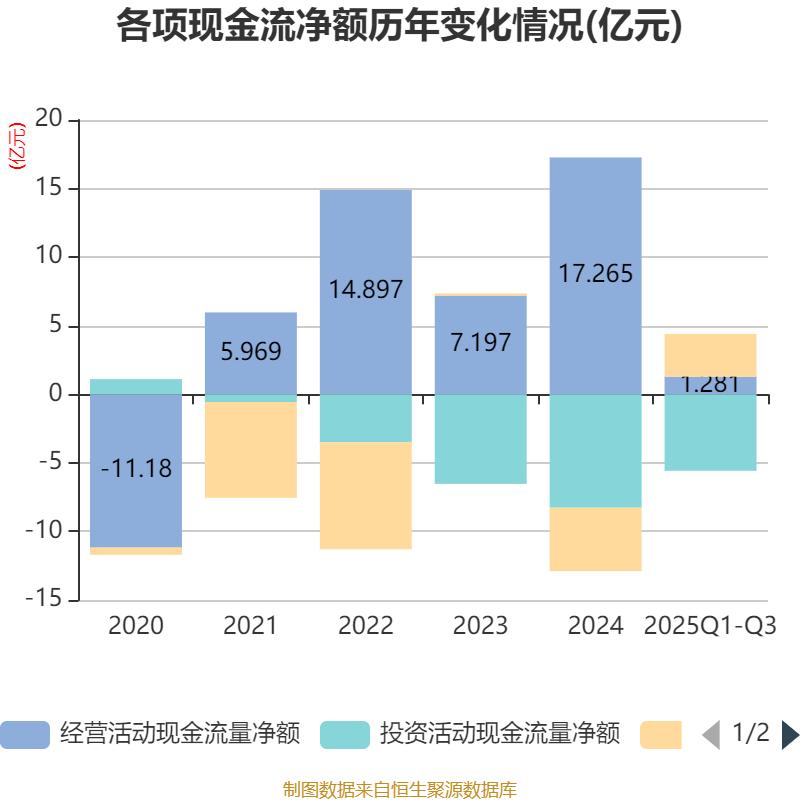 2025年前三季度,公司经营活动现金流净额为1.28亿元,同比下降76.09%;筹资活动现金流净额3.12亿元,同比增加8.25亿元;投资活动现金流净额-5.58亿元,上年同期为-5.79亿元。