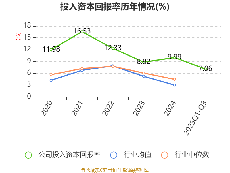 盈利能力方面, 2025年前三季度公司加权平均净资产收益率为7.9%,同比下降0.62个百分点。公司2025年前三季度投入资本回报率为7.06%,较上年同期下降0.83个百分点。