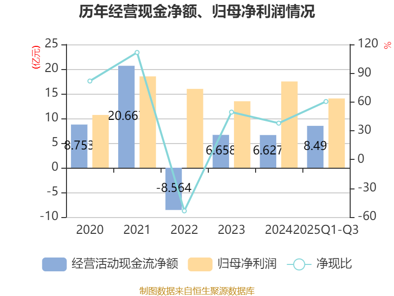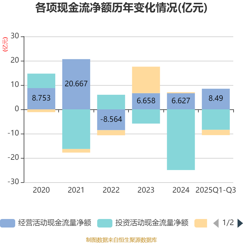 2025年前三季度,公司经营活动现金流净额为8.49亿元,同比增长1578.96%;筹资活动现金流净额-2.2亿元,同比减少1.5亿元;投资活动现金流净额-8.42亿元,上年同期为-23.62亿元。