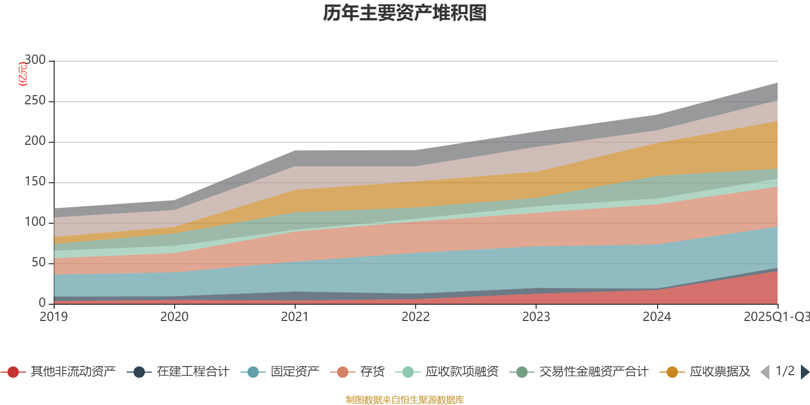 资产重大变化方面,截至2025年三季度末,公司其他非流动资产较上年末增加137.11%,占公司总资产比重上升7.46个百分点;交易性金融资产合计较上年末减少55.36%,占公司总资产比重下降7.42个百分点;固定资产较上年末减少6.81%,占公司总资产比重下降4.74个百分点;应收票据及应收账款较上年末增加44.06%,占公司总资产比重上升4.04个百分点。